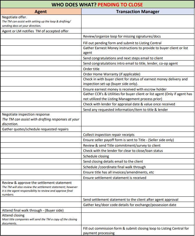 No, the brilliance of a TM is the work they do keeping the transaction well organized including corresponding with lenders, title, clients, and co-op agents within an agent’s transaction. The Transaction Manager does not perform any sales support related functions, nor does the TM attend closings.